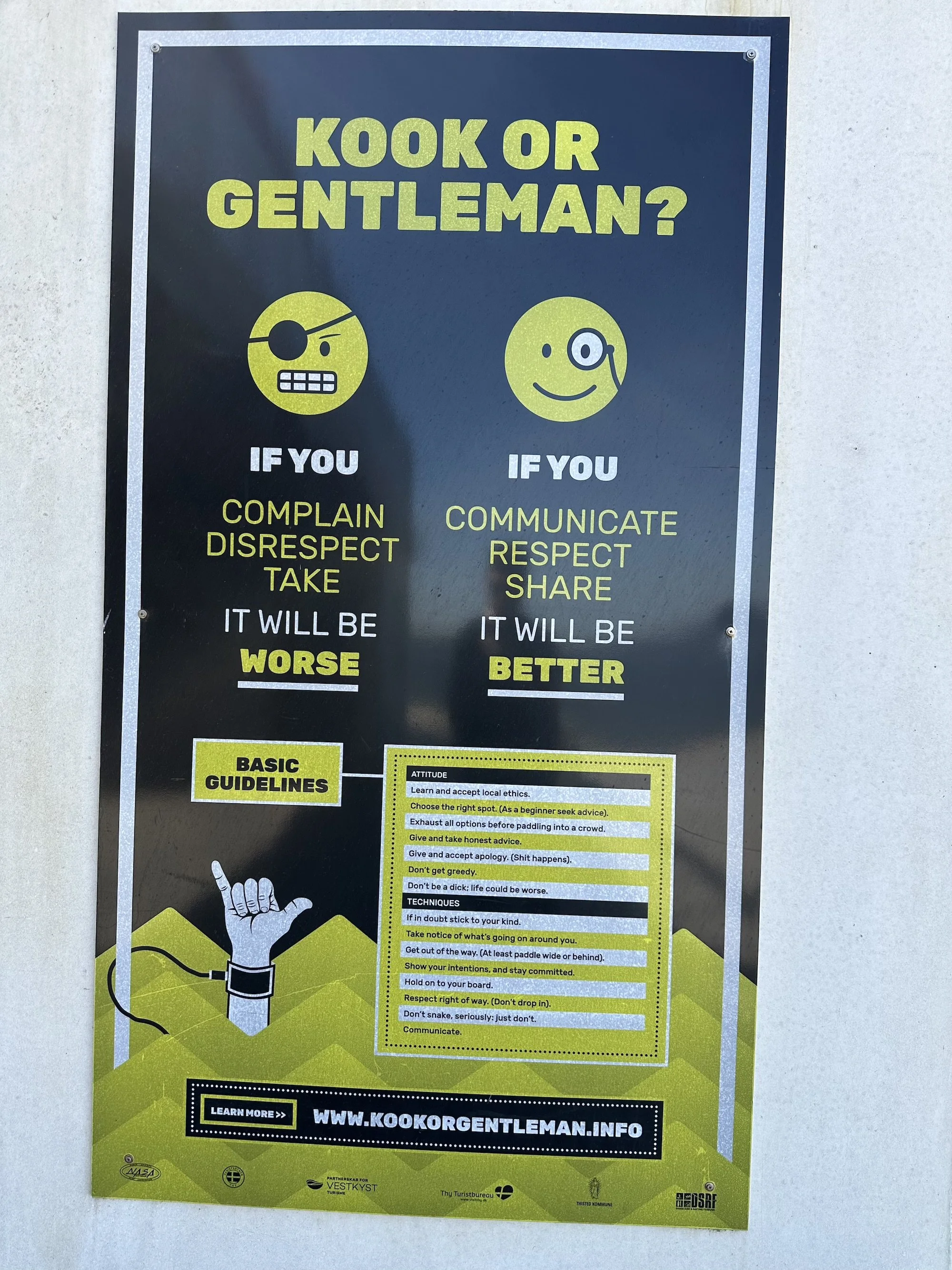 In dem einen kleinen Surfer-Dorf in der Nähe haben wir ein Schild gesehen mit ein paar Verhaltens-Empfehlungen. Die passen nicht nur zum Surfen 🙂!