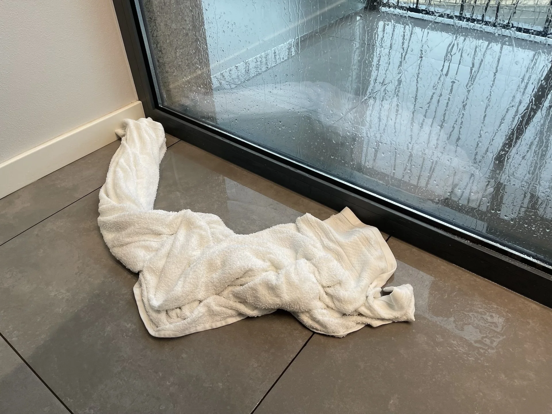 Das war ehrlich gesagt aber auch echt unser Glück! Wir haben nämlich relativ bald gemerkt, dass richtig viel Wasser von der Balkonseite reinläuft. Sowohl an der Tür als auch an der kompletten Fensterfront.